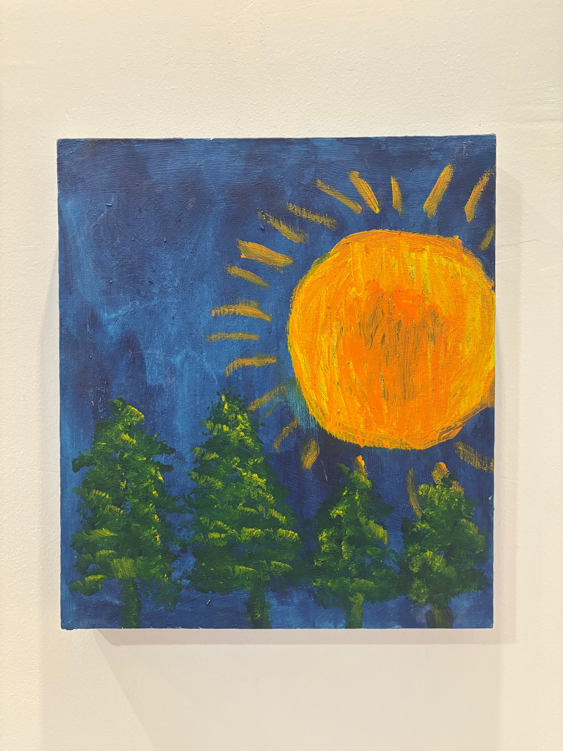 Un brillante sol anaranjado se asoma entre un grupo de pinos verdes sobre un cielo azul profundo. La escena transmite energía, naturaleza y calidez en un solo vistazo.