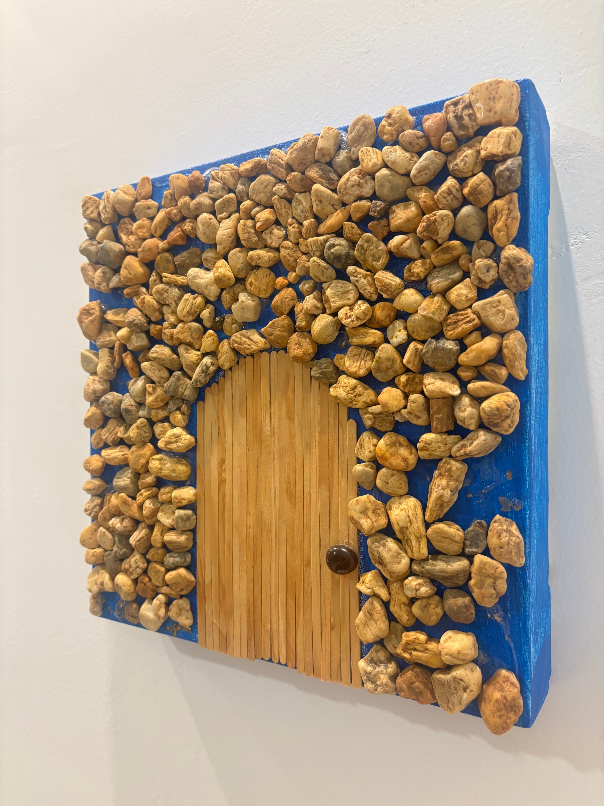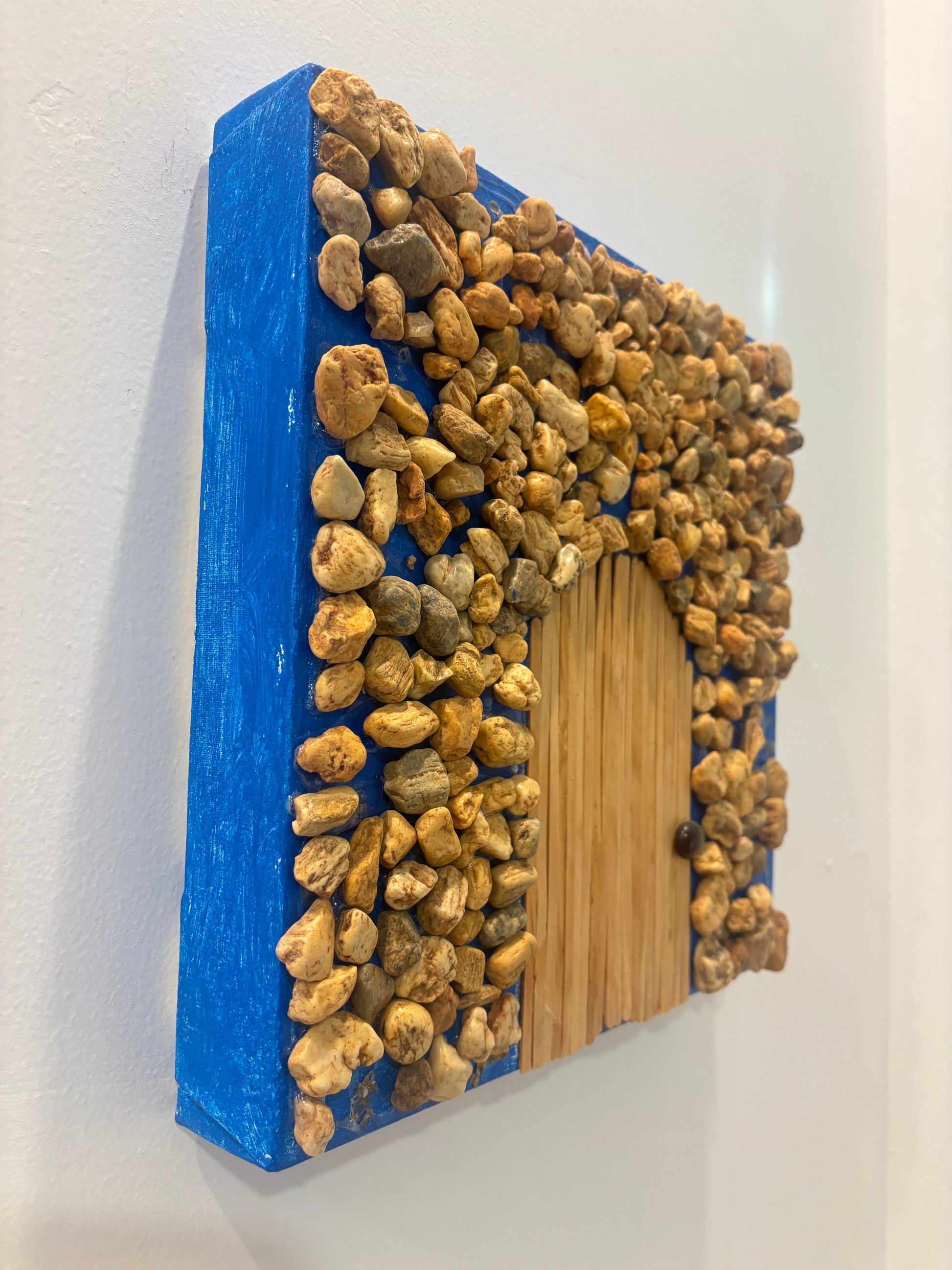 Una puerta hecha con palitos de madera queda enmarcada por una estructura de pequeñas piedras naturales sobre un fondo azul intenso. Esta pieza evoca entrada, refugio y curiosidad, como si invitara a descubrir lo que hay del otro lado.