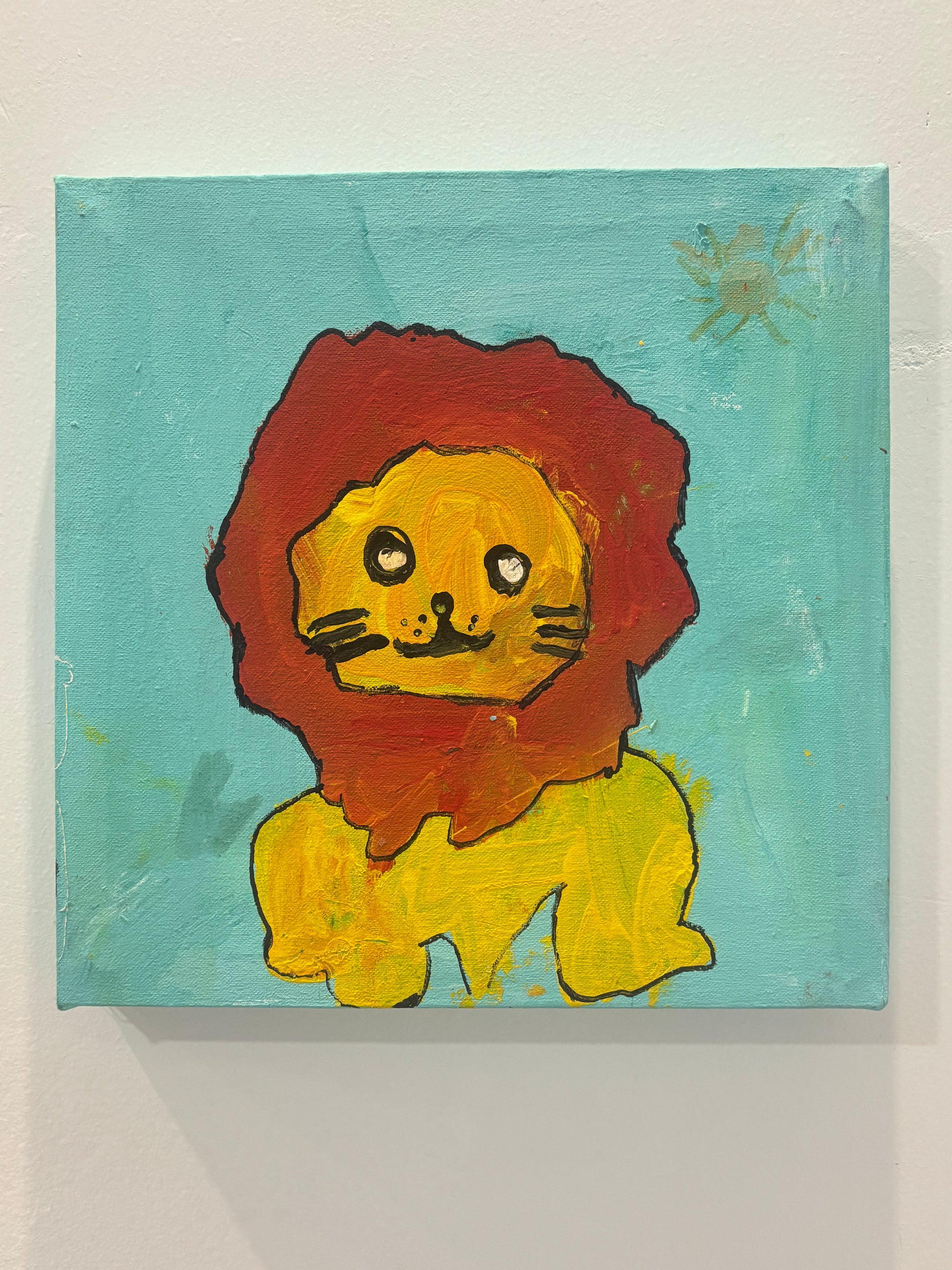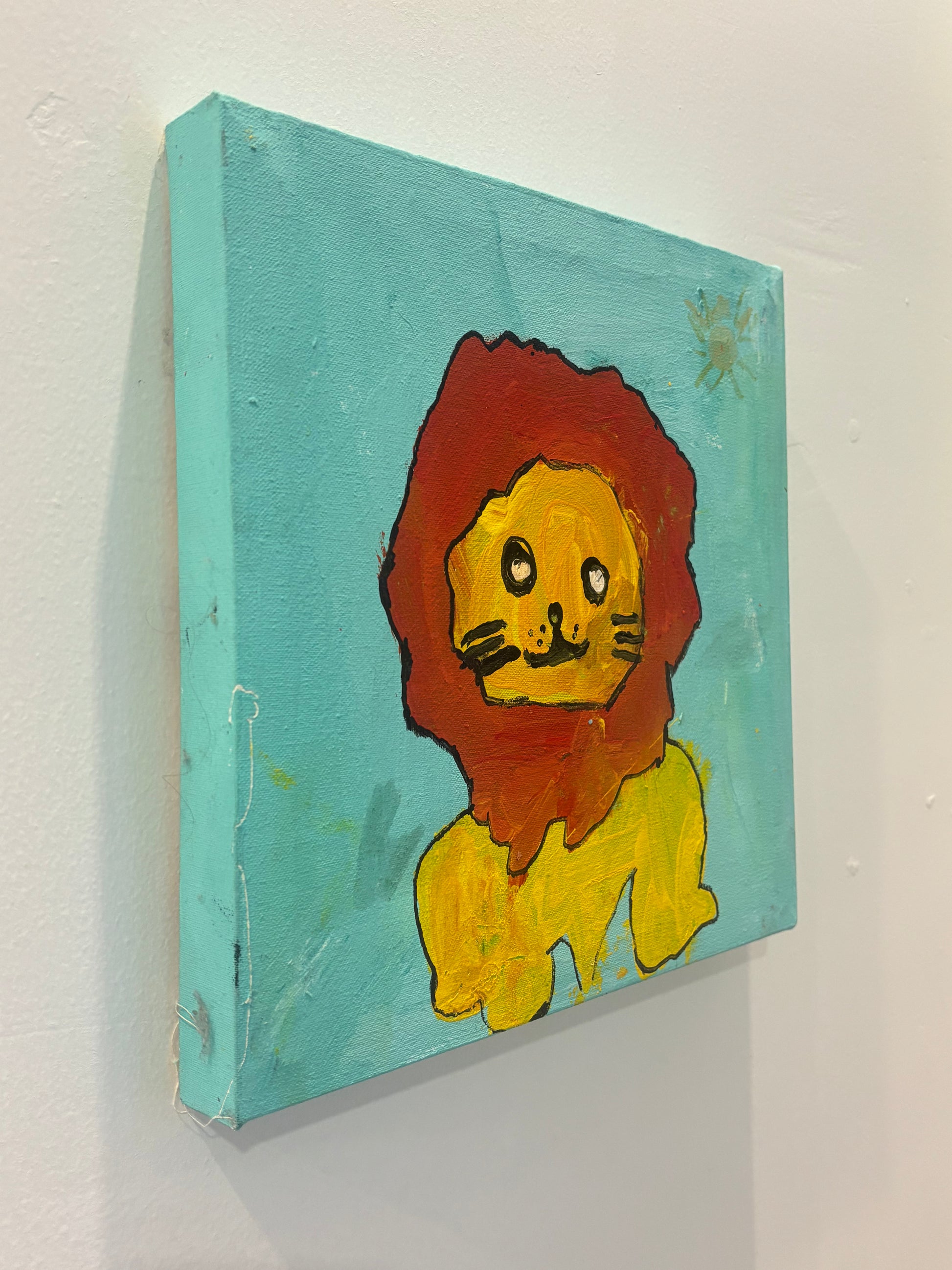 Un león de colores vivos y expresión amigable, pintado con trazos espontáneos que capturan la ternura infantil. Perfecto para dar vida a habitaciones infantiles o espacios con encanto.