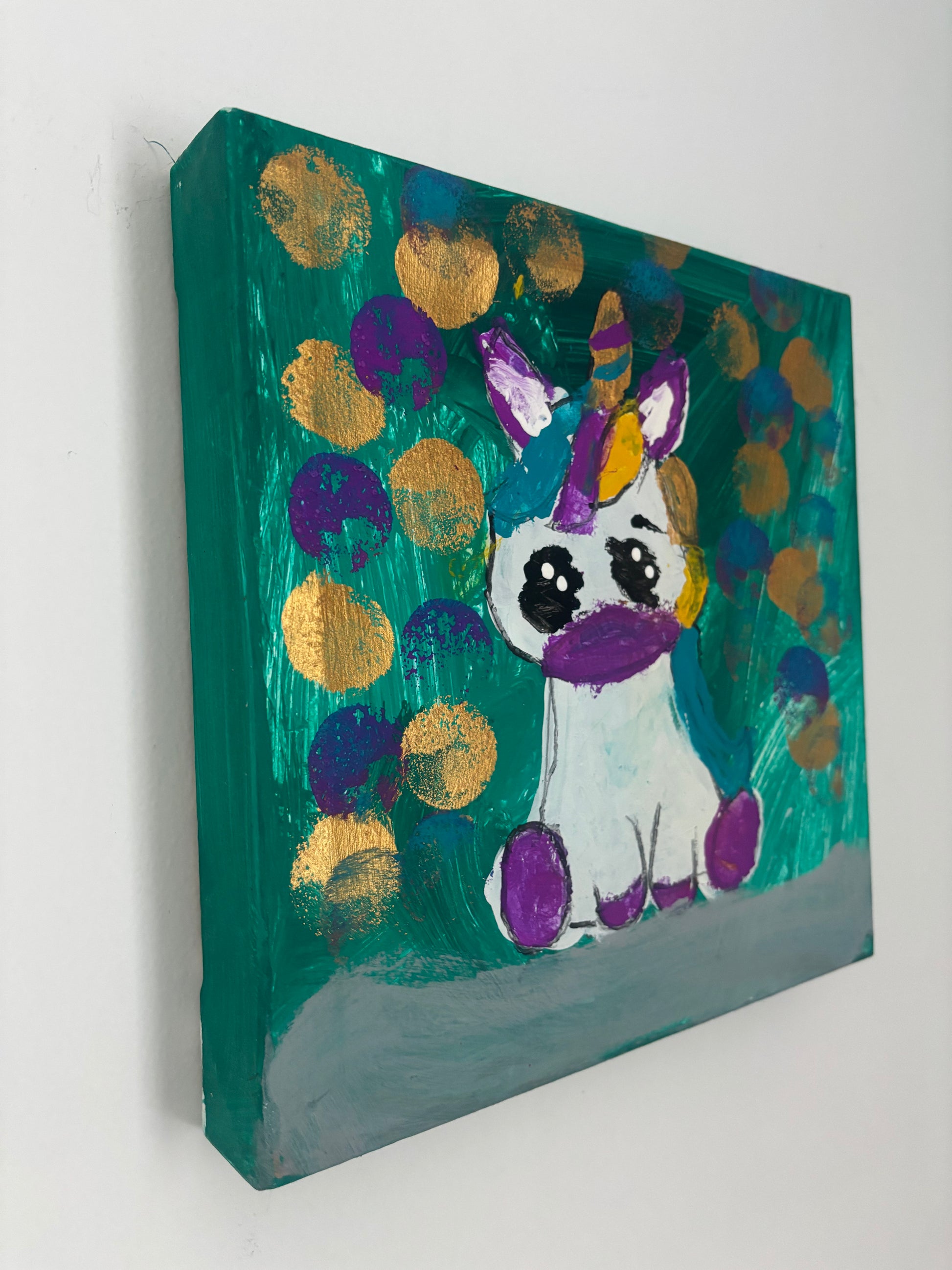 Este pequeño unicornio, con mirada dulce y cuerno brillante, parece estar rodeado de burbujas doradas en un bosque encantado. La obra transmite ternura y fantasía, ideal para decorar espacios infantiles o para quienes aman los seres mágicos.