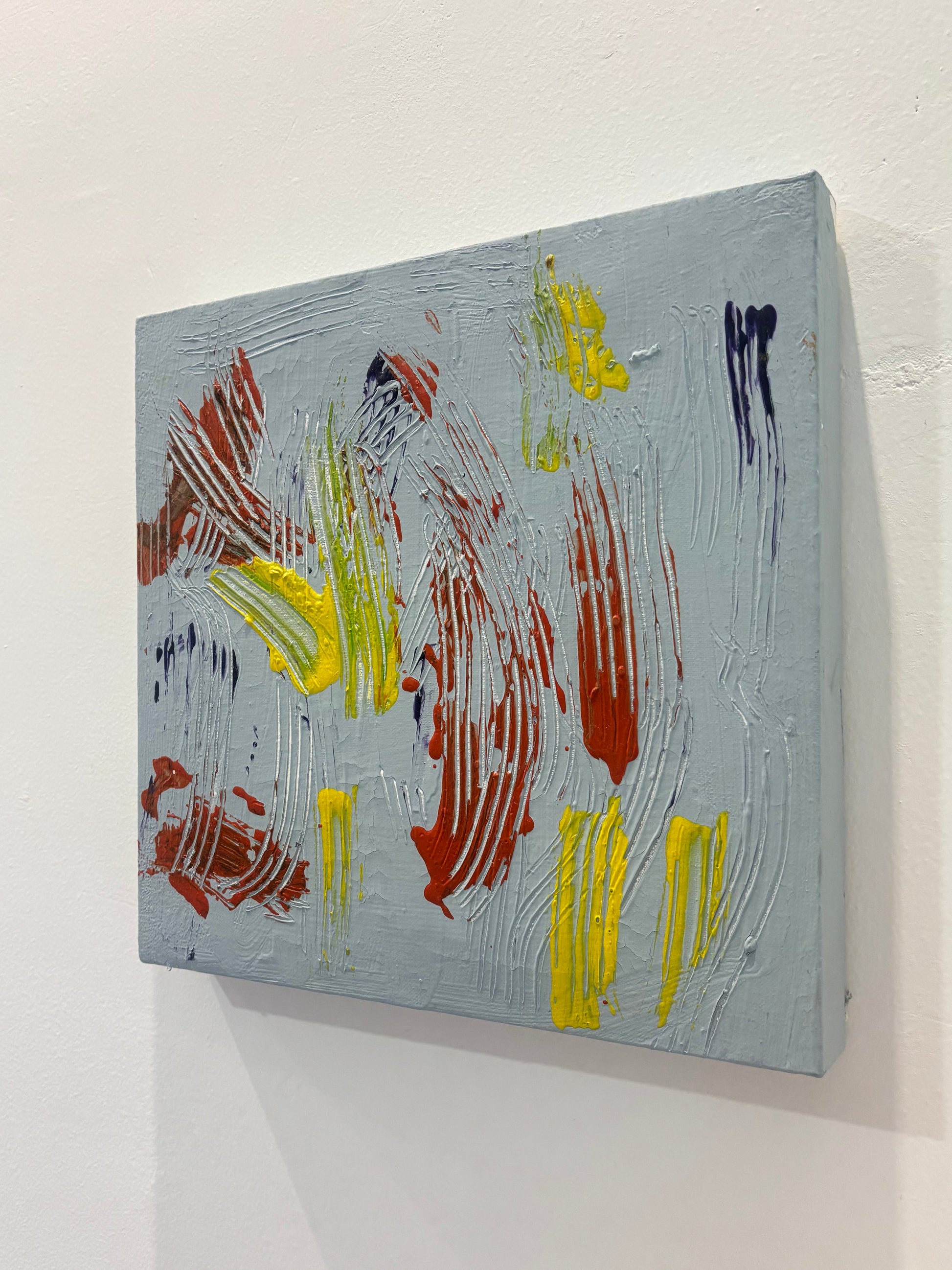 Trazos curvos y texturizados de rojo, amarillo y azul se deslizan sobre un fondo gris, generando una composición energética y espontánea. Esta pieza abstracta invita a la imaginación y aporta vitalidad a cualquier espacio.