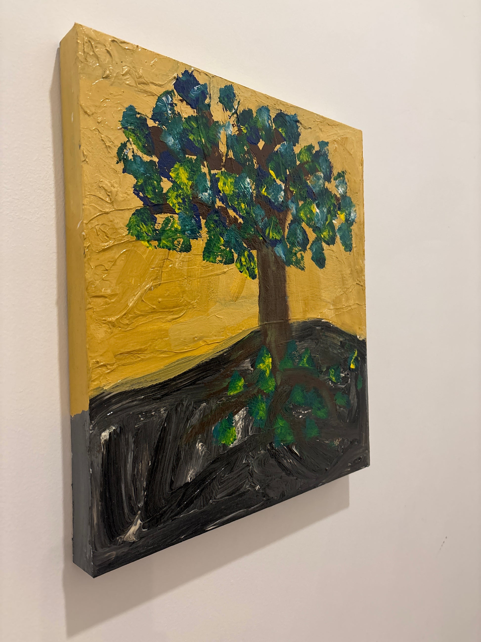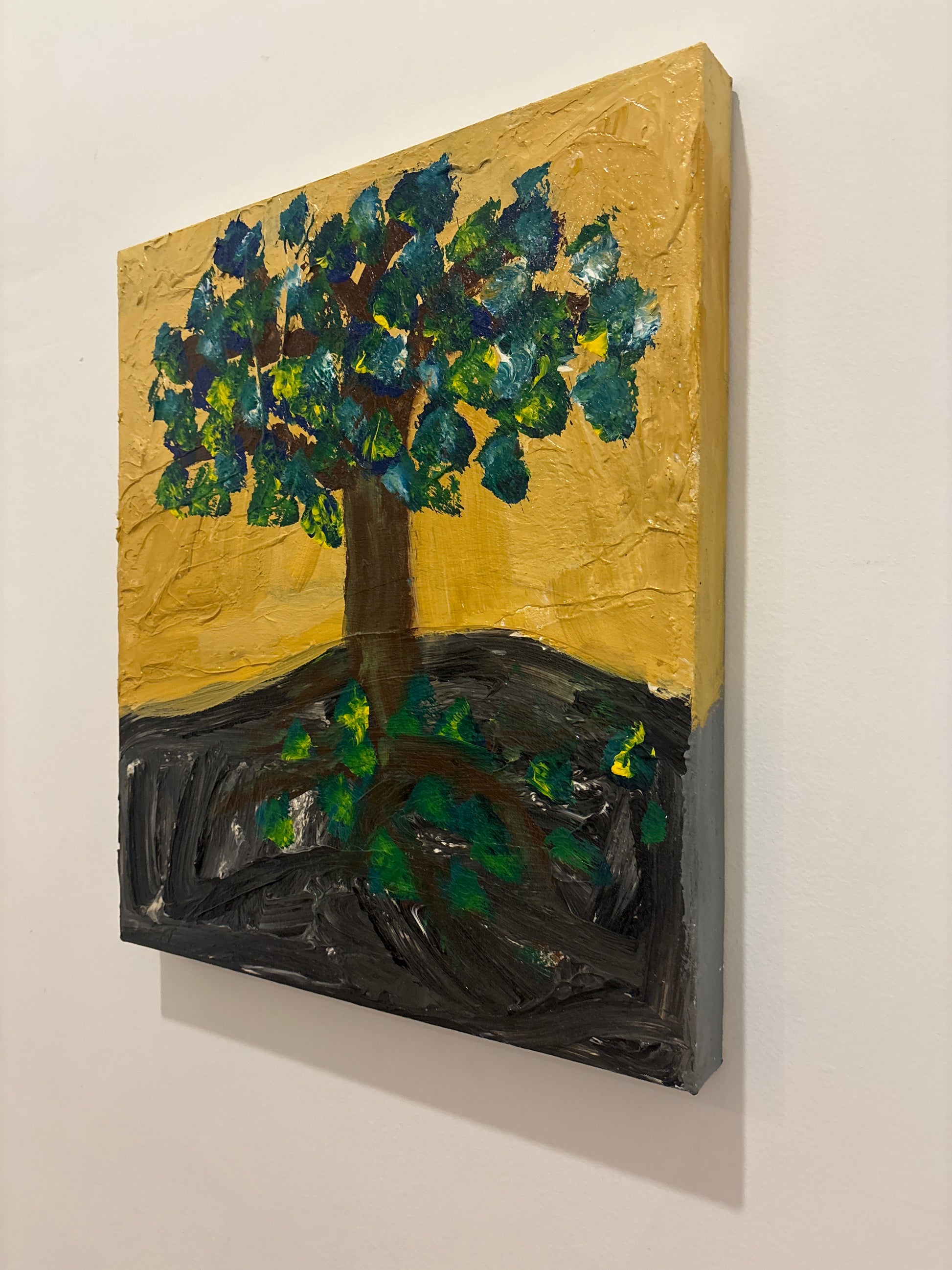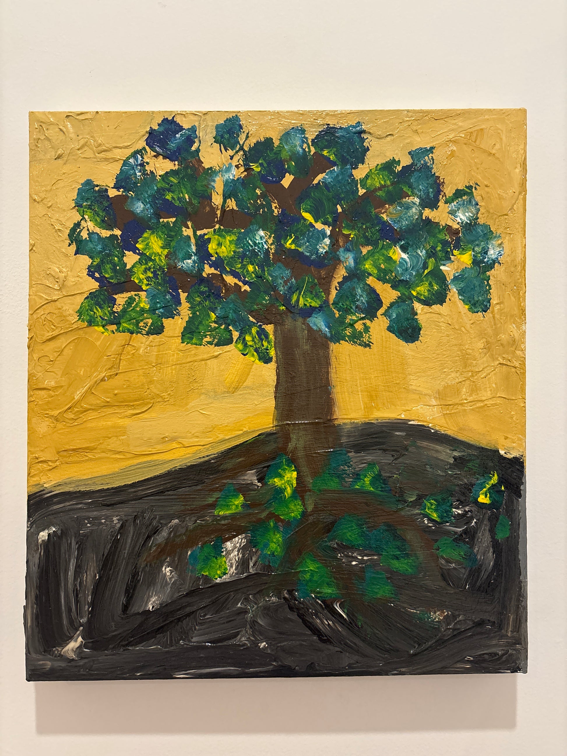 Esta obra muestra un árbol de copa abundante con hojas en tonos verdes, azules y amarillos, que brota sobre un fondo dorado cálido. Las raíces visibles en la tierra oscura dan una sensación de profundidad y fuerza interior. Es una pieza que transmite vida, estabilidad y conexión con la naturaleza.