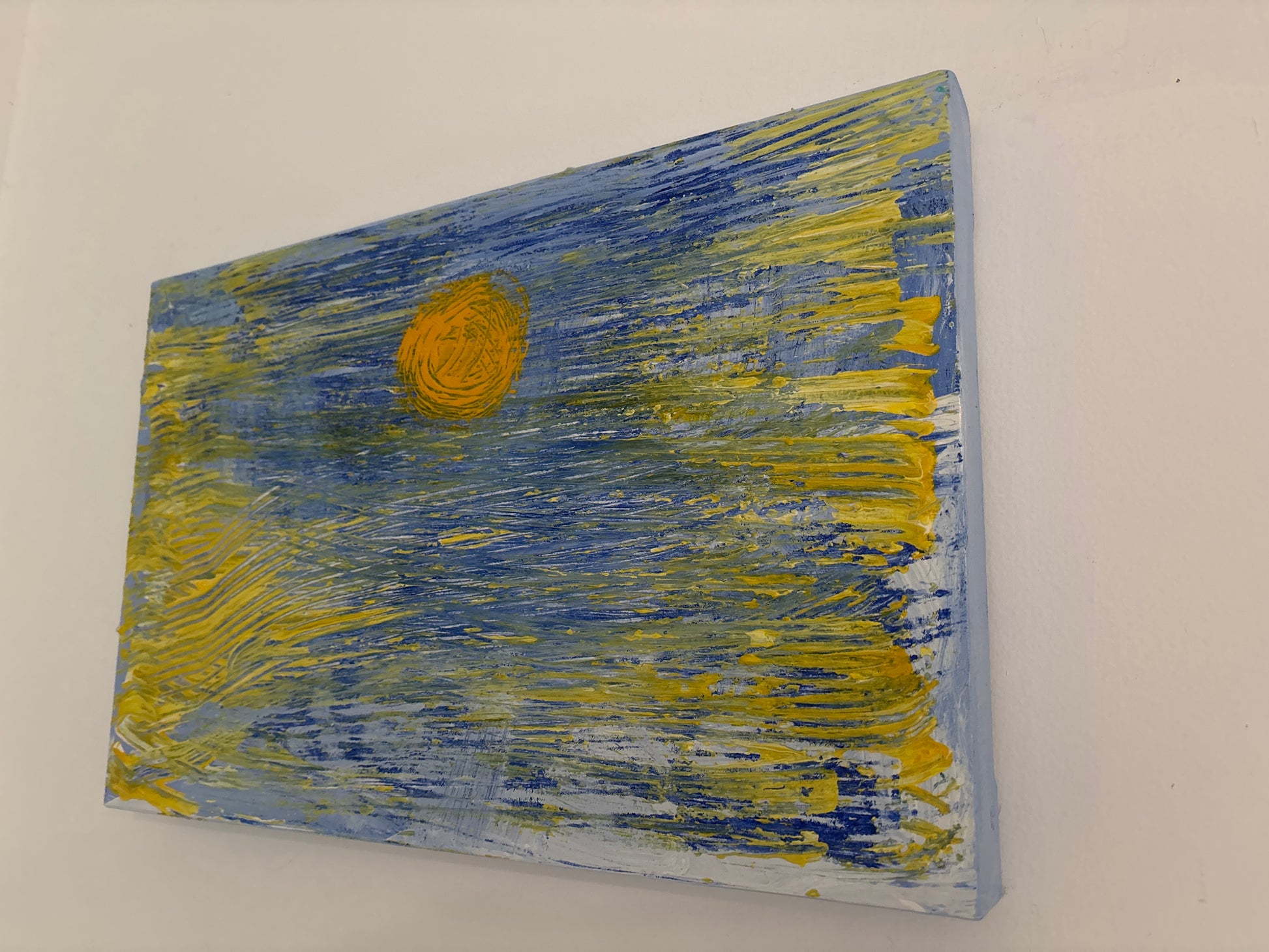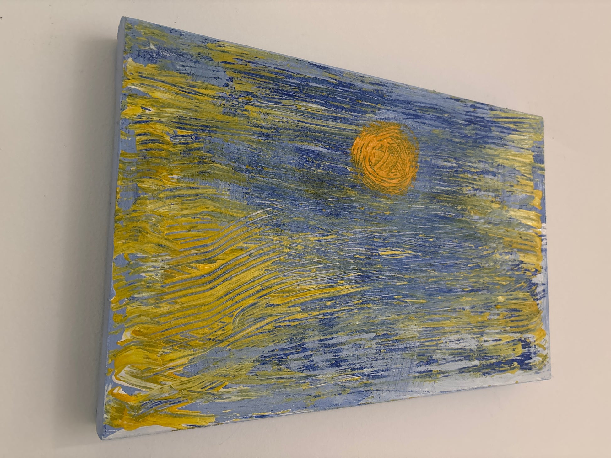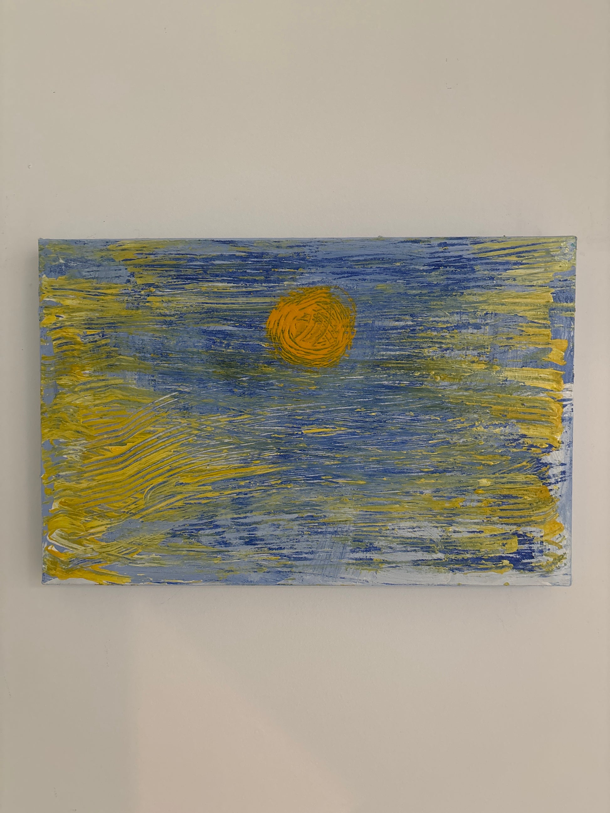 Trazos amarillos y azules se entrelazan para formar una atmósfera vibrante que evoca un campo bañado por el sol. Esta obra abstracta captura el movimiento del viento y la calidez del día.